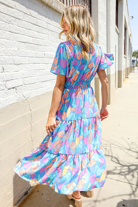 Can't Say No Blue Tropical Floral Frill Notch Neck Bubble Sleeve Dress