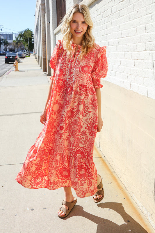 Can't Look Away Coral Notch Neck Scallop Trim Smock Sleeve Midi Dress