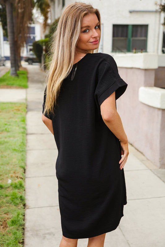 Casual Chic Black Woven Notched V Neck Dolman Sleeve Frock