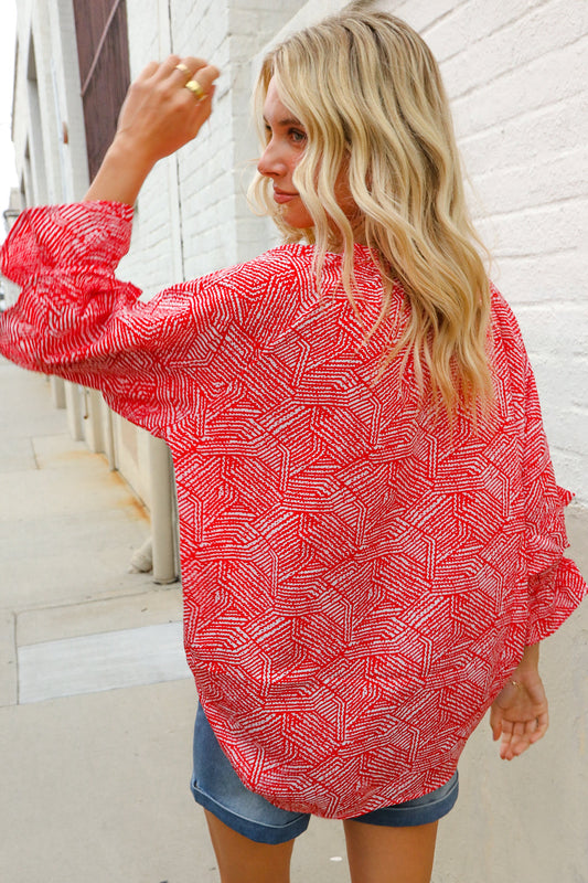 Diva Dreams Red Abstract Print Double Ruffle Sleeve Tie Blouse