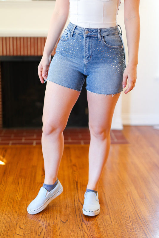 Judy Blue Casual Glam High Rise Rhinestone Embellished Denim Shorts