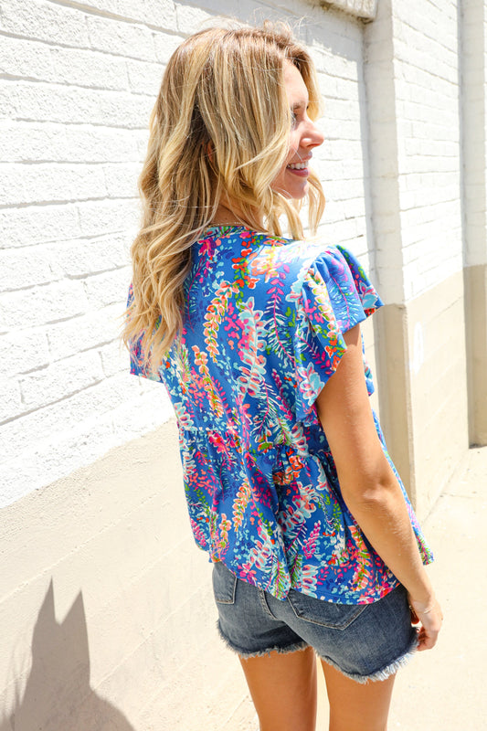 Flower Power V Neck Flutter Sleeve Woven Blouse