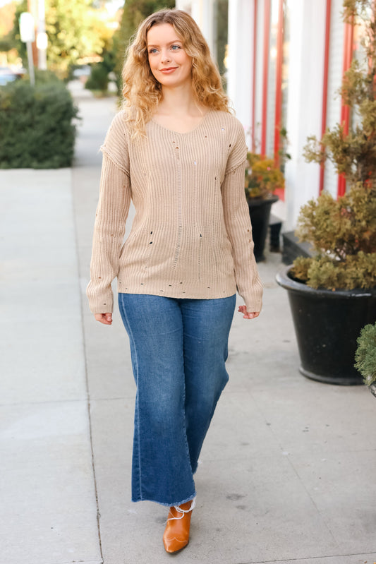 The Slouchy Taupe Distressed V Neck Sweater