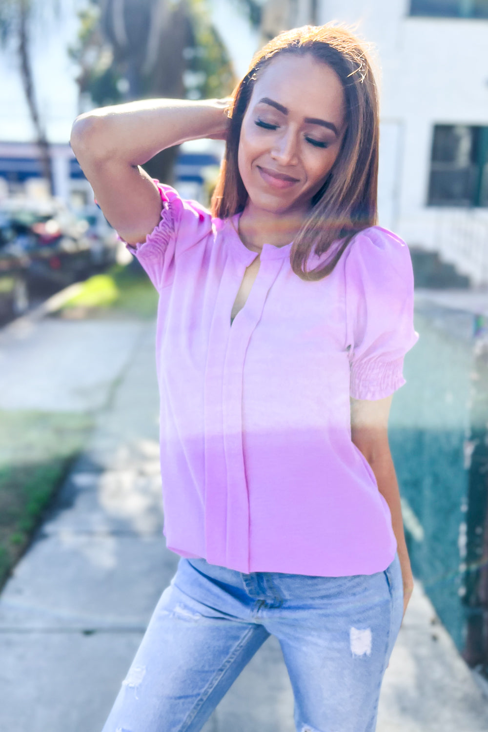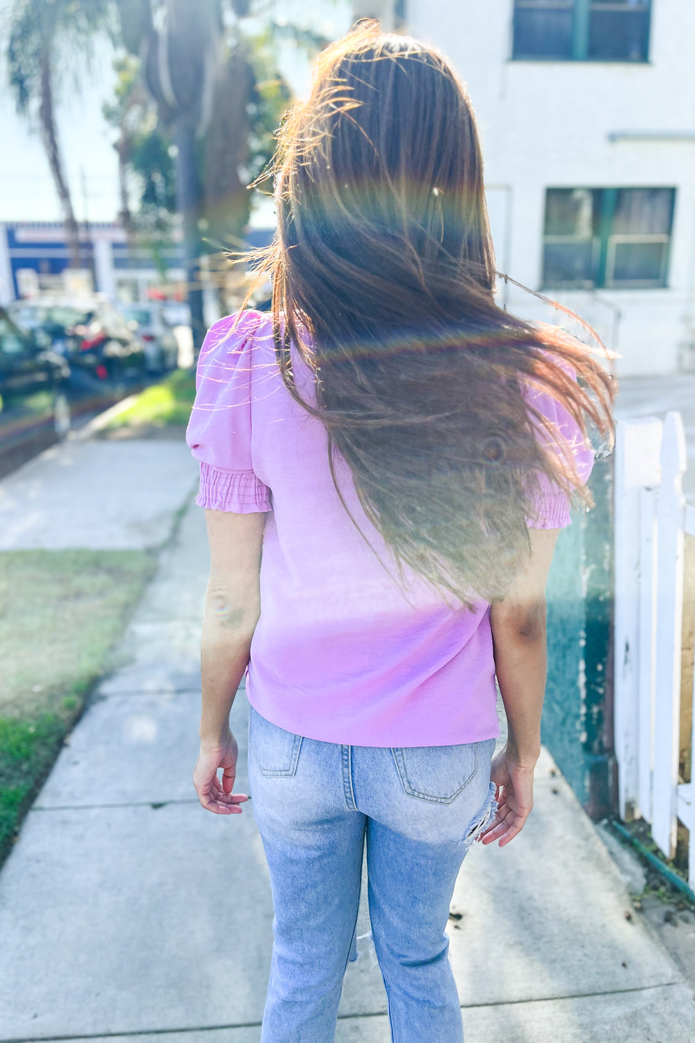 Elegant You Lilac Notched Neck Smocked Short Sleeve Blouse