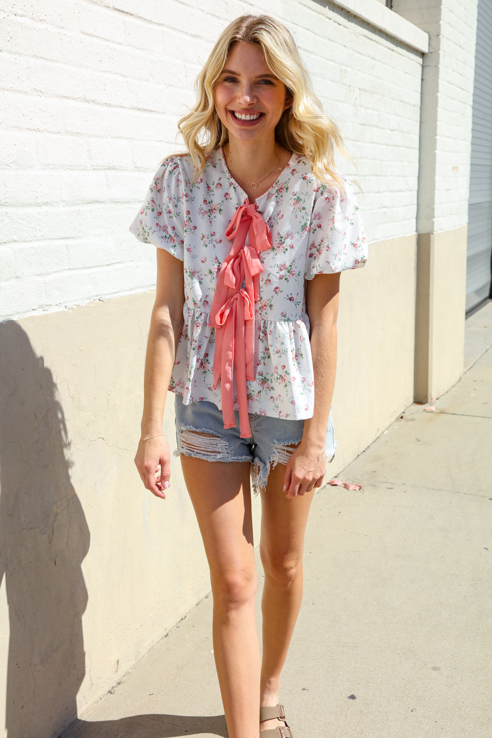 Designed with silky ribbon bow ties and a vintage floral fabric, this woven babydoll top with folded puff sleeves is versatile and will brighten up any room or occasion you wear it to. Be prepared to stun!