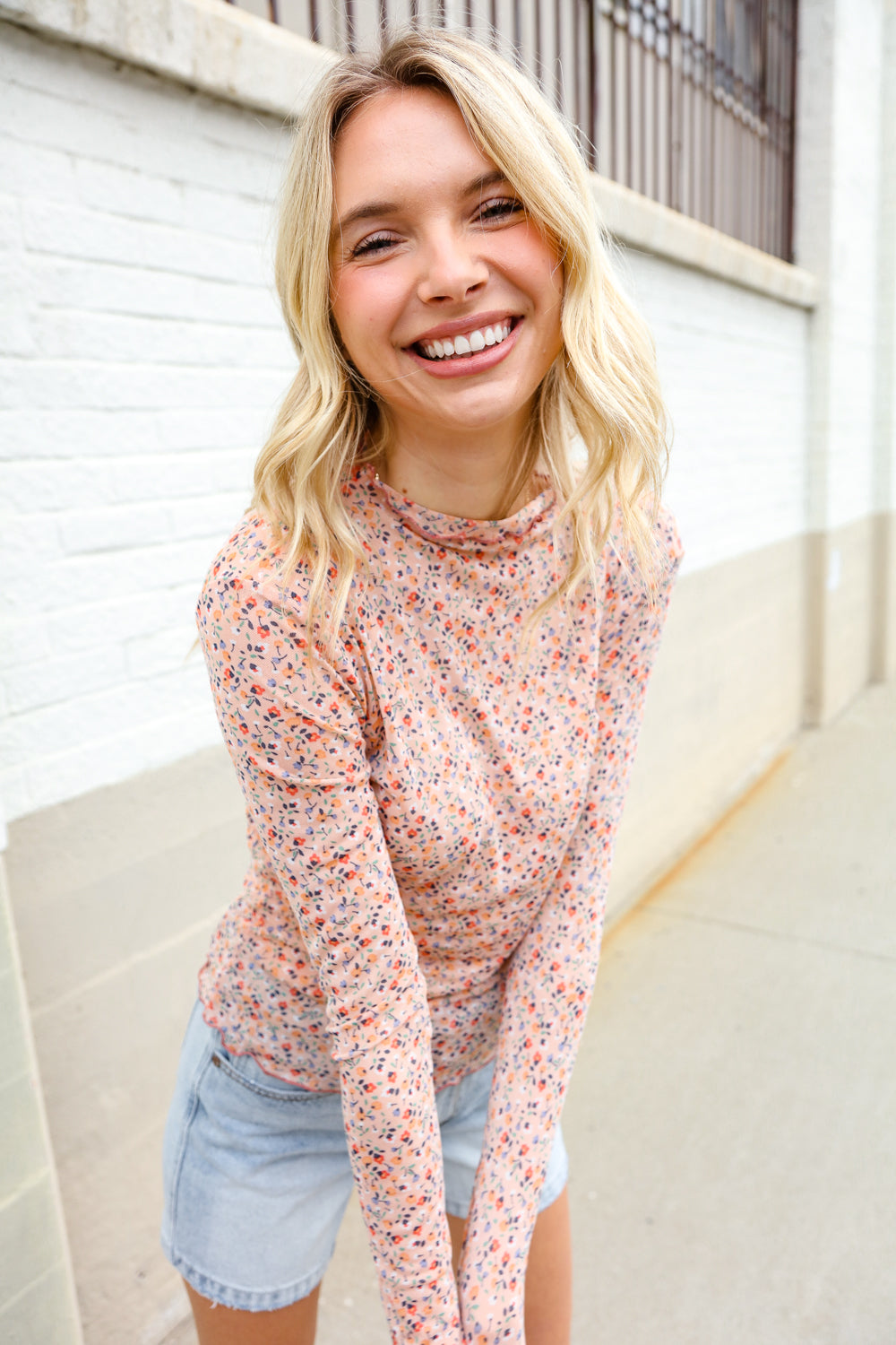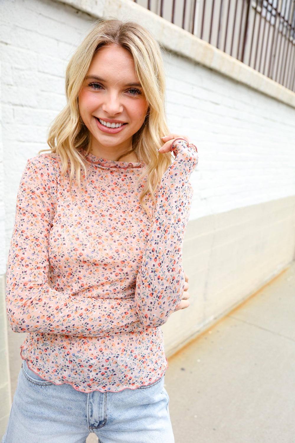 Follow Me Coral Semi Sheer Floral Mesh Frill Neck Top