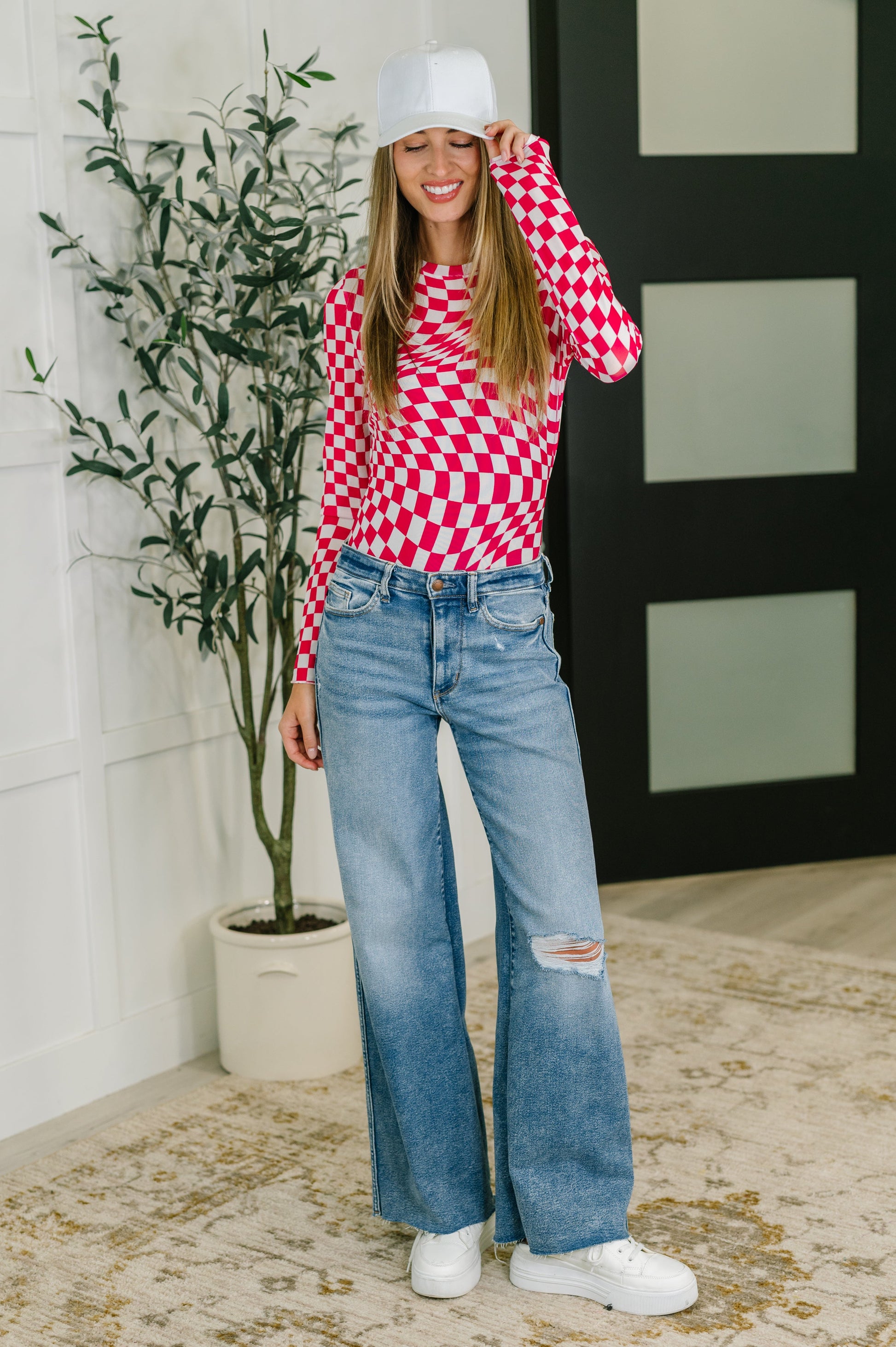 Make a statement in the Sheer Long Sleeve Checkered Layering Top, crafted from a breathable mesh knit with high stretch for a close, comfortable fit. The banded round neckline adds structure to the otherwise daring, completely sheer silhouette, while the checkered pattern brings a cool, graphic edge. Designed for layering over or under — this top is your go-to for adding attitude to any outfit.
