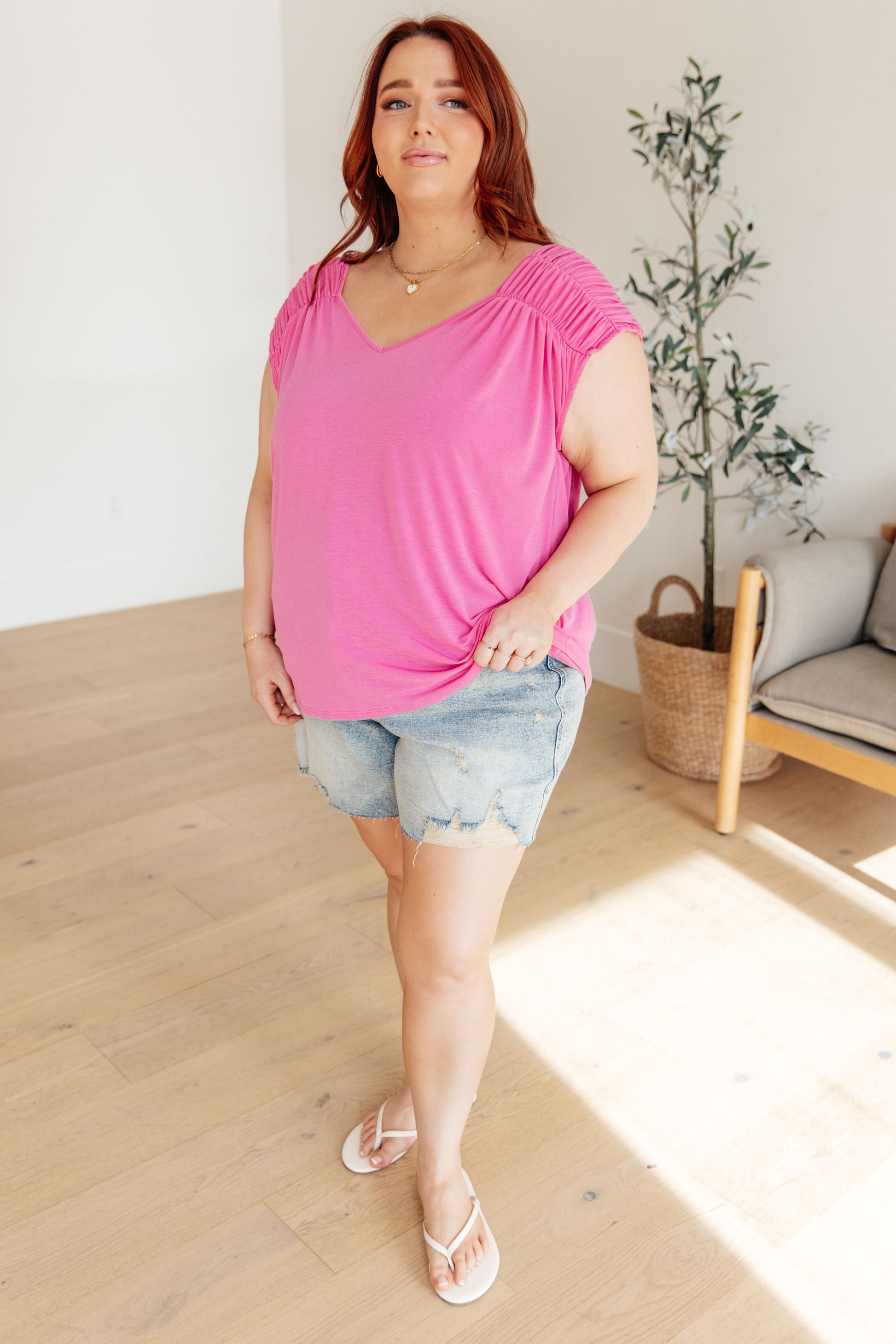 Effortlessly cool and playful, our Ruched Cap Sleeve Top is a must-have addition to your wardrobe. The gathered elastic shoulders and tie back create a relaxed fit, while the bulgari fabric keeps you cool and wrinkle-free. Perfect for a casual day out or a fun night in.