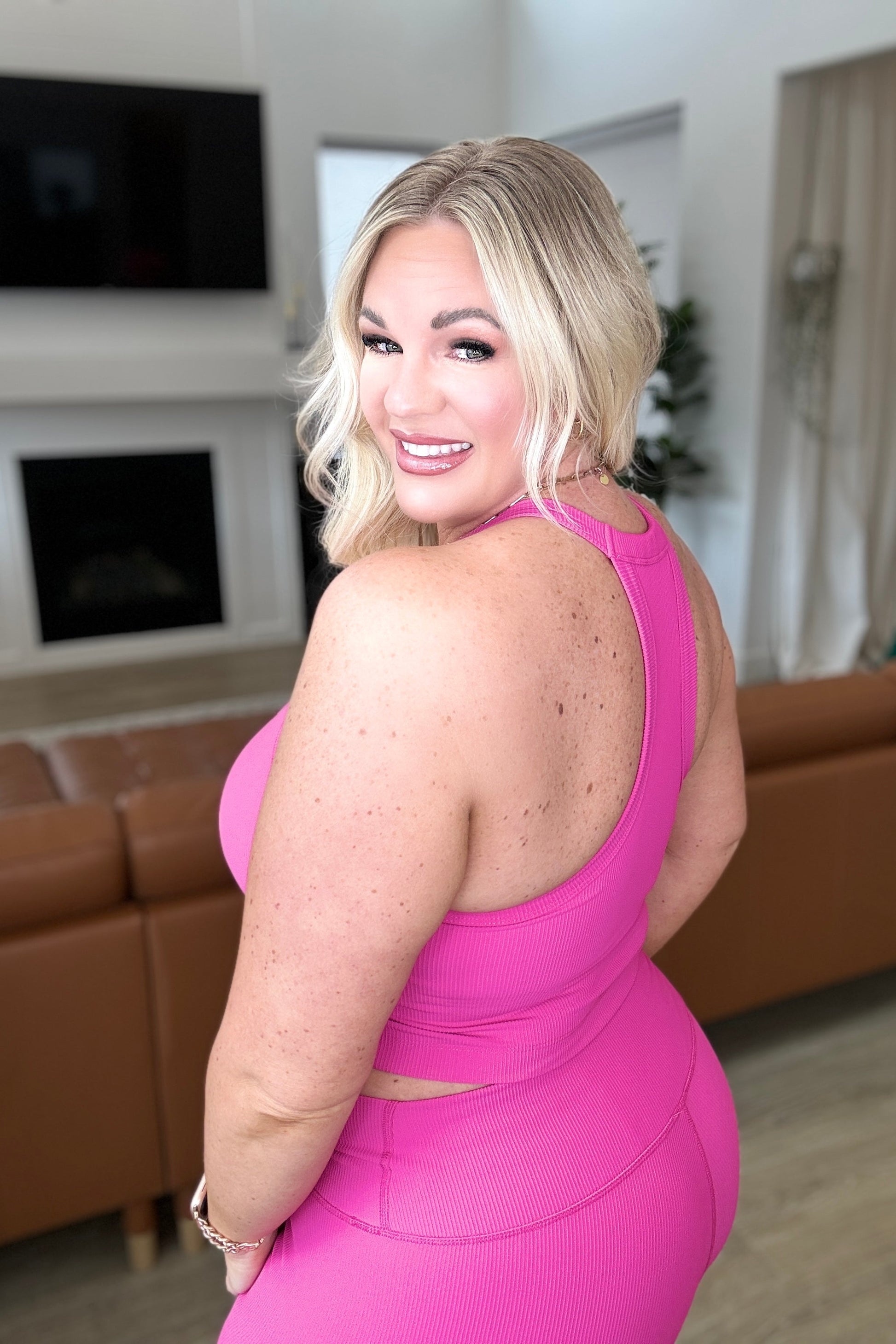 Wrap your body in sweet style with the Sweet Thang Cropped Tank in Pink. This ribbed tank offers high stretch for a comfortable fit, while the built-in bra and removable pads provide support and versatility. The high neck and racerback style add a touch of trendy flair. (It really checks all the boxes for a must-have tank!)